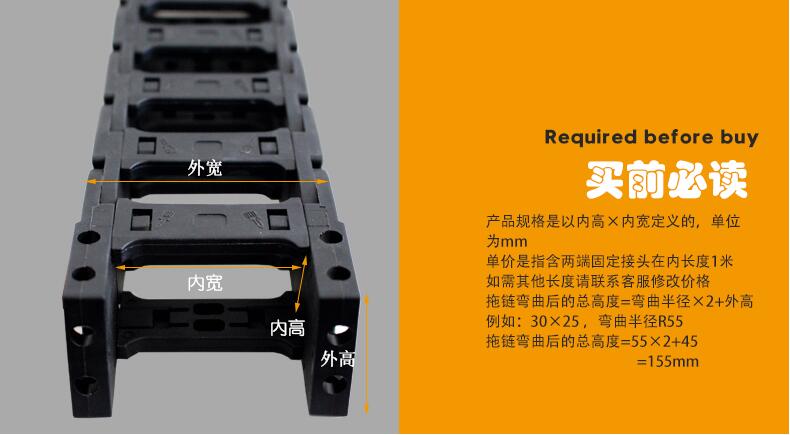 TL型塑料拖鏈規(guī)格是以內(nèi)高x內(nèi)寬定義的,單位為mm