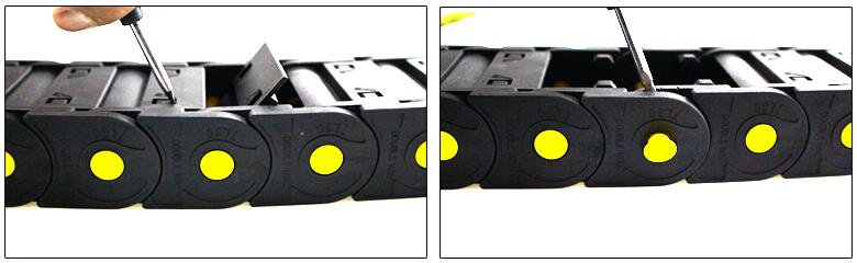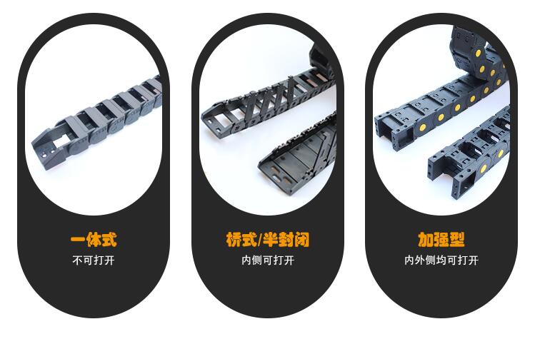 TL塑料拖鏈分為一體式(不可打開)、橋式/半封閉(內(nèi)側(cè)可打開)和加強(qiáng)型(內(nèi)外側(cè)均可打開)三種。